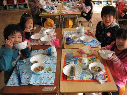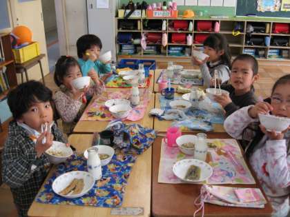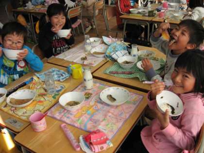 今日の給食風景シリーズを開始します。子ども達の幸せそうな表情をお届けできればと思います。でも、苦手なメニューの日もあるかもしれませんね。嗜好は今後多分に変化するものです。あせらずに・・・。苦手なものでも好きになることだって十分ありますよね。ちなみに私は子どものころ野菜という野菜が大嫌いでした。でも、今は薬味にネギは欠かせません。というわけで今では、野菜はほとんど食べられます。でも、あのトマトだけは今でも絶対に食べられません。世の中で一番嫌いな食べ物、それはトマトで〜す。(野崎)