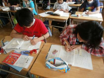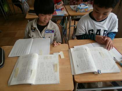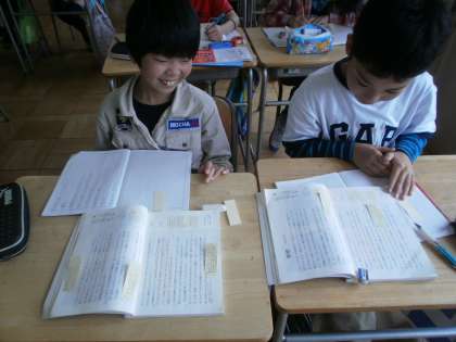 筆者の意図を読み取り、Q&Aを作り、作った問題を付箋に書き教科書に貼っていきました。積極的に活動し、たくさんQ&Aをつくることができました。