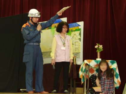 今日は、春日井市の女性フォーラム、春日井消防署、青パト、春日井市生活安全課の皆さんに来ていただき、大地震などが起こった時の正しい対処方法について教えていただきました。自分の命を守るために、大切なことを学ぶことができましたね。