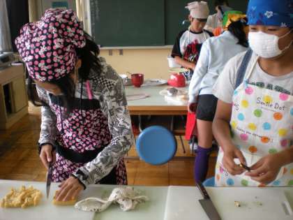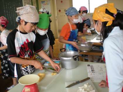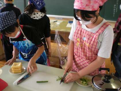 6年 家庭科調理実習(1) 公開日 2011/05/17 更新日 2011/05/17 6年生 2組では、「ごはんとみそ汁」の調理実習を行いました。班で協力して、大根や油揚げを切ったり、米を洗って煮たりして、とてもおいしいごはんとみそ汁をつくることができました。