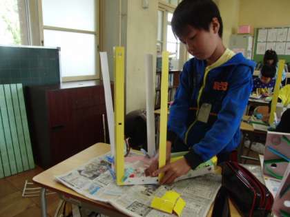 ネットで授業参観(図工)その1 公開日 2011/05/24 更新日 2011/05/24 4年生 4年1組の図工です。「コロコロ・コロガラート」がかなりできあがってきました。それぞれ、工夫をこらしたコース作りがしてあります。完成が楽しみですね!