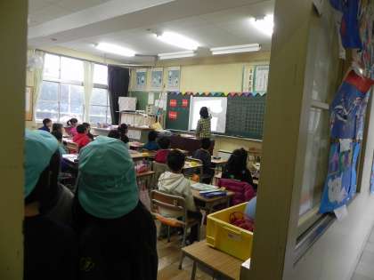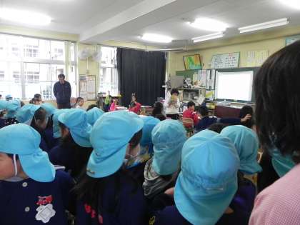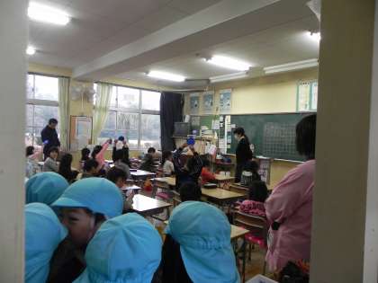 生活科の授業「1年生って楽しいよ」でおもちゃを作りました。保育園のお友達が授業を見学した後、体育館で一緒におもちゃで遊びました。みんな楽しく遊べました。