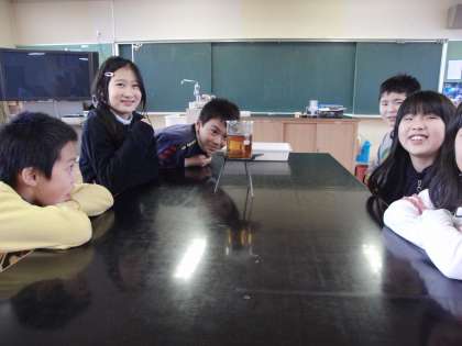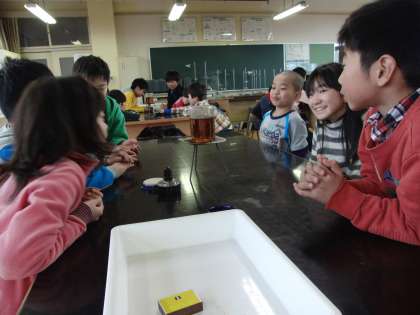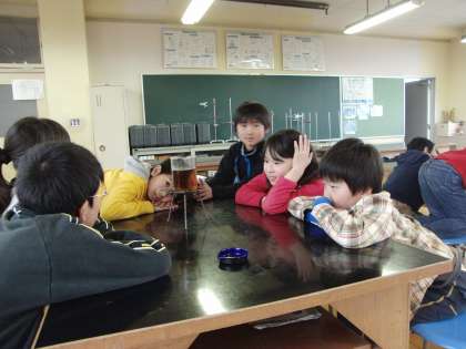 「もののあたたまりかた」の授業で、水がどのようにあたたまるのか実験している様子です。単純な事実ですが、実験するのは楽しいですね。