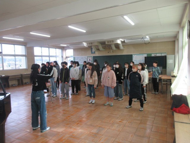 はじめに2学期にいろいろな場面で頑張った人たちの表彰伝達がありました。次に長い休みの時に気を付ける「4つの車の話」をみんなで確認しました。それから6年生の指揮と伴奏で校歌を歌いました。最後に冬休みの生活についてのお話を聞きました。