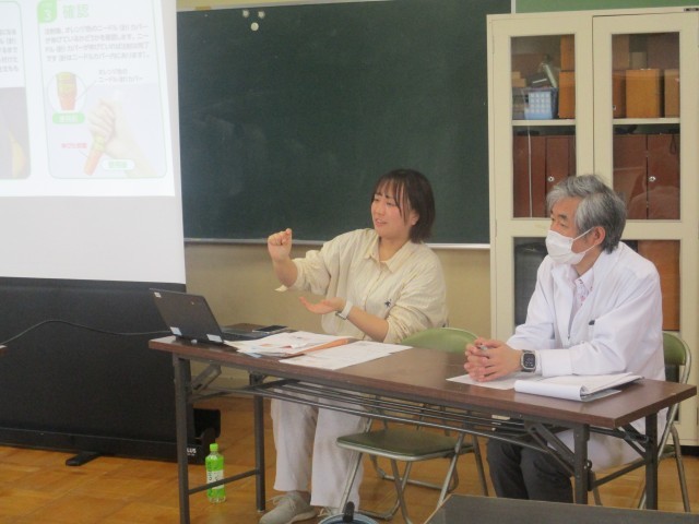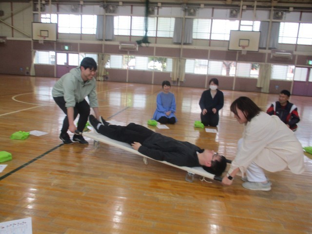 新学期が始まる前に、学校薬剤師さんと教職員による応急手当やエピペンの使い方、嘔吐物処理の講習会を行いました。また、AEDや担架の置き場や使い方も確認し、万が一への備えを行うことができました。