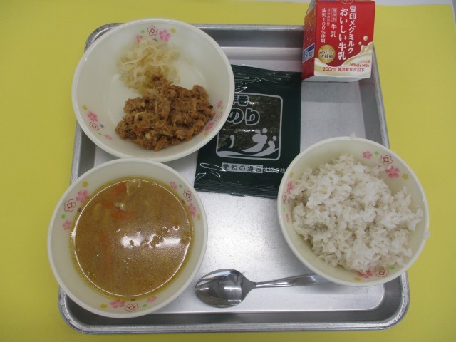 4月14日の給食は、麦ごはん、牛乳、スタミナ汁、まぐろの甘辛煮、刻みたくわん、手巻きのり でした。