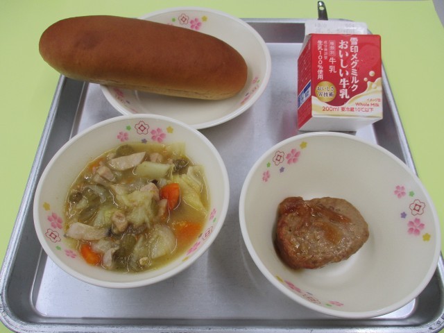 今日の献立は、黒ロールパン、牛乳、ふき入り春野菜のスープ煮、ハンバーグの玉ねぎソースかけでした。ふきは、愛知県で栽培がさかんに栽培され、スーパーなどに出回っているふきの約4割が愛知県産だそうです。おいしく食べることができましたか。