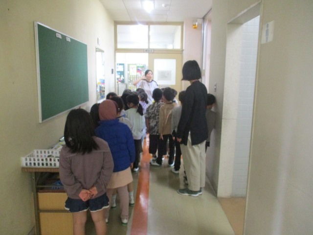 1時間目に、1年生の子どもたちが、校長室や職員室、放送室を訪れました。校長室ではいろいろな質問をしていました。