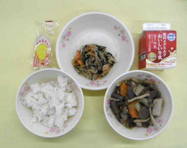 今日の給食は、主食が「ご飯」、副菜が「いも煮」と「ほうれん草とツナのお浸し」、そして「牛乳」と「月見団子」です。
