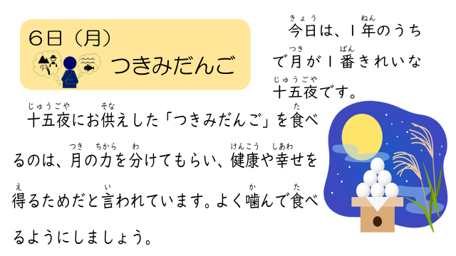 今日の食育メモは、「月見団子」についてでした。ぜひ、ご家庭でも話題にしてみてください。