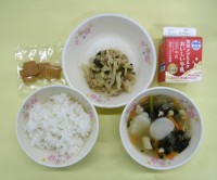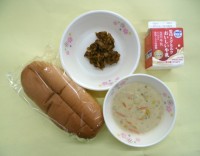 今日の給食は、主食が「麦ご飯」、主菜が「さんまフライ」、副菜が「ボイルキャベツ」、汁物が「豚汁」、そして「牛乳」と「小袋ソース」です。