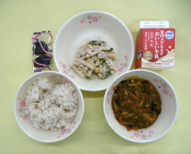 今日の給食は、主食が「麦ご飯」、主菜が「きのこのキーマカレー」、副菜が「シャキシャキポテトサラダ」、そして「牛乳」と「プルーン」です。