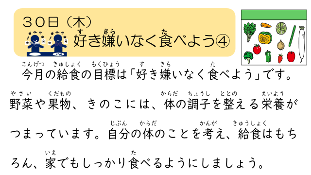 今日の食育メモは、「好き嫌いなく食べよう」についてでした。ぜひ、ご家庭でも話題にしてみてください。