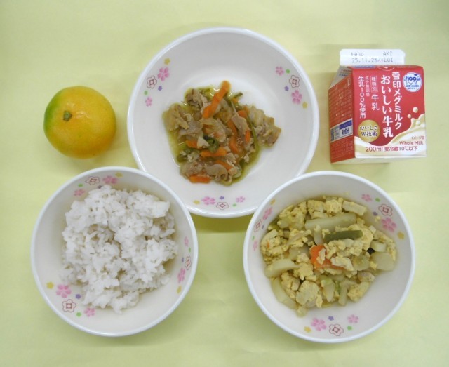 今日の給食は、主食が「麦ご飯」、主菜が「高野豆腐の玉子とじ」、副菜が「いろどり炒め」、そして「牛乳」と「みかん」です。