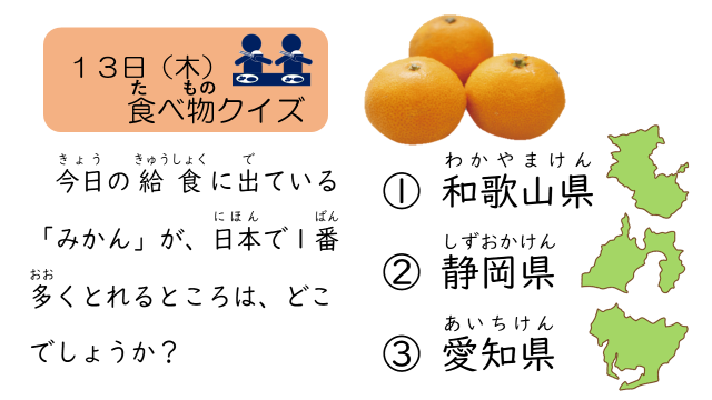今日の食育メモは、「みかん」についてのクイズでした。ご家庭でも話題にしていただけると嬉しいです。ぜひ、お子さんに答えを聞いてみてください。