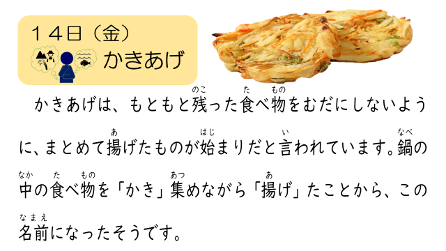 今日の食育メモは、「かき揚げ」についてでした。ぜひ、ご家庭でも話題にしてみてください。