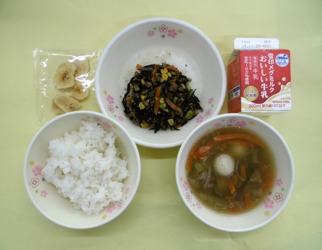 今日の給食は、主食が「ご飯」、主菜が「ひじき入り豚そぼろ」、汁物が「だまこ汁」、そして「牛乳」と「バナナチップス」です。