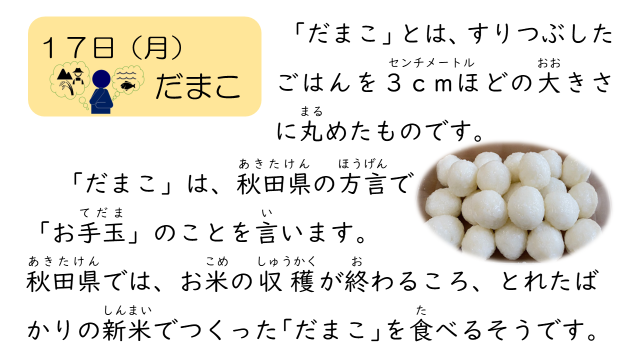 今日の食育メモは、「だまこ」についてでした。ぜひ、ご家庭でも話題にしてみてください。
