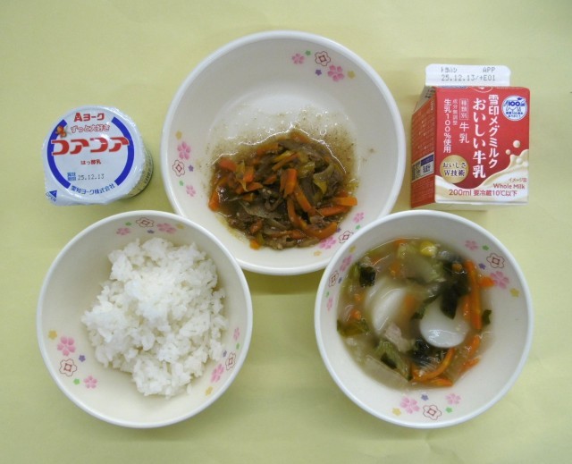 今日の給食は、主食が「ご飯」、主菜が「プルコギ」、汁物が「トックスープ」、そして「牛乳」と「ヨーグルト」です。