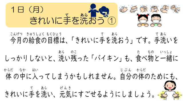 今日の食育メモは、「きれいに手を洗おう」についてでした。ぜひ、ご家庭でも話題にしてみてください。