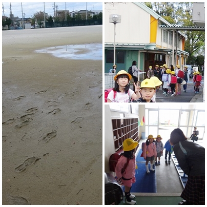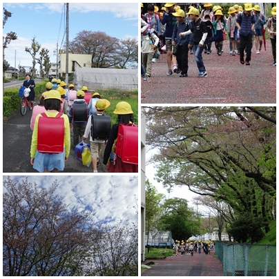 花びらが散った上を歩いています。右側を2列できちんと並んでの登校です。これから新緑の季節に入っていきます。昨夜の雨で運動場の一部がぬかるんでいます。子どもは、自分の足跡をつけたく歩いて行ったようですね。昇降口では先生がお迎えです。