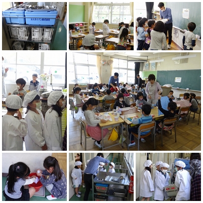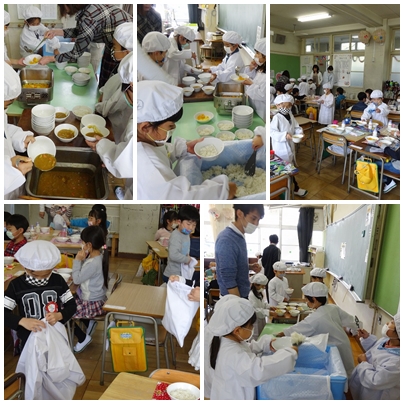 先生から、給食の手順を聞いて、給食当番が白衣を着て、準備に取り掛かりました。廊下にあるコンテナから自分のクラスの食缶を取り出すことから始まります。上手にご飯やおかずをお椀に次ぐことができました。誰に配ろうか戸惑いながらもしっかりと配っていました。