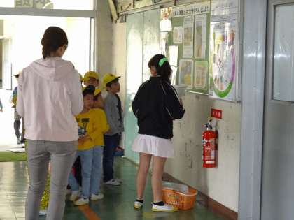 昼放課に子どもたちが栄養教師に給食の献立の栄養について話を聞いていました。