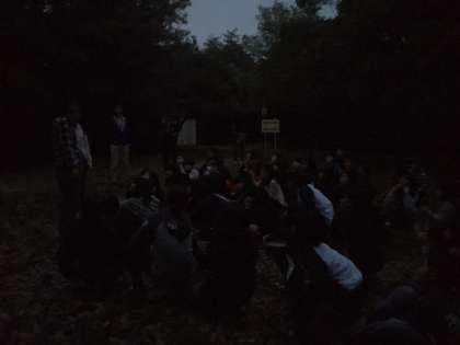 真っ暗な森の中を歩いて行きます。途中、展望台から明日ハイキングで登る、弥勒山、大谷山を眺め、その後、名古屋の夜景を見ました。無事全員が戻ったことを確認して終了です。