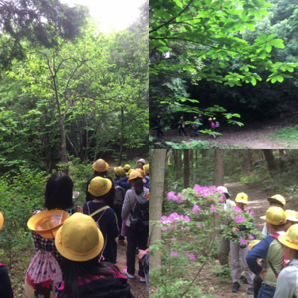 ハイキングの途中で、自然観察会の人にガイドをしてもらいながら登ります。ホウノキ もちツツジなど見ています。