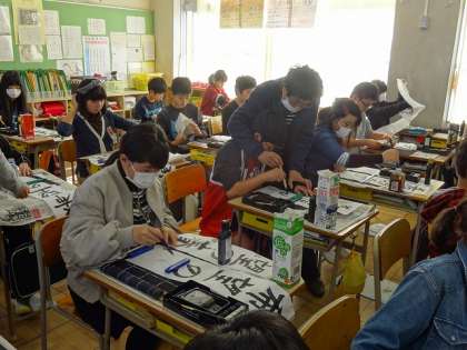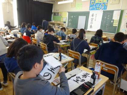 書写の時間で、「希望の春」の字を真剣に書いていました。