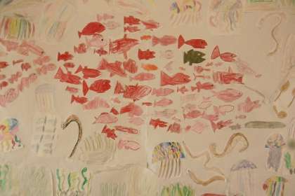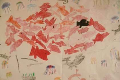 国語の教科書に出てくる「スイミー」を描いて作品にしていました。