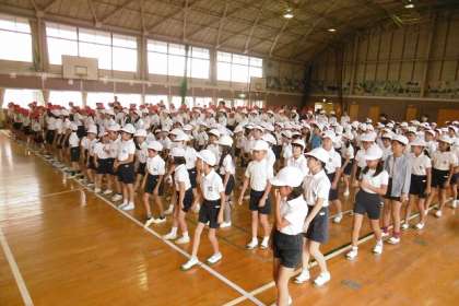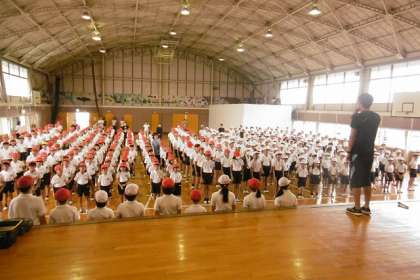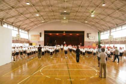 今日は運動場が昨夜の雨でぬかるんでいるので、体育館で準備体操・ストレッチの練習をしました。