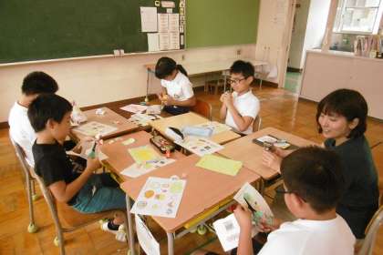 5組は弁当の塗り絵をハサミで切って、弁当箱に詰めていました。