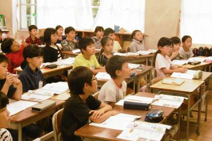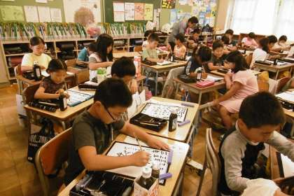 1組は書の時間で、書道の先生に教えてもらい、自分の名前を練習していました。
