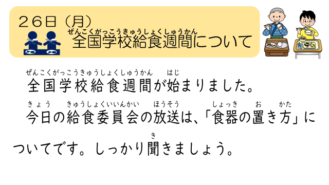 今日の食育メモは、「全国学校給食週間」についてでした。給食委員会から、「食器の置き方」について放送しました。ぜひ、ご家庭でどんな内容だったか聞いてみてください。