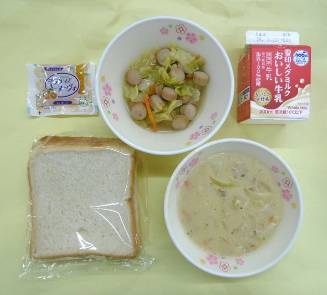今日の給食は、主食が「スライスパン」、主菜が「キャベツとウインナーのソテー」、汁物が「コーンポタージュ」、そして「牛乳」と「みかんジャム」です。