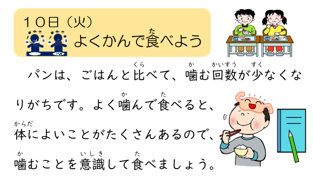 今日の食育メモは、「よく噛んで食べよう」についてでした。ぜひ、ご家庭でも話題にしてみてください。