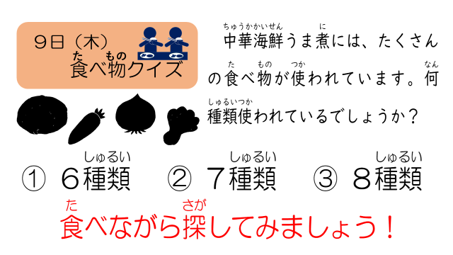 今日の食育メモは、「中華海鮮うま煮」についてのクイズでした。ご家庭でも話題にしていただけると嬉しいです。ぜひ、お子さんに答えを聞いてみてください。
