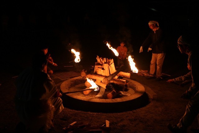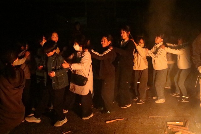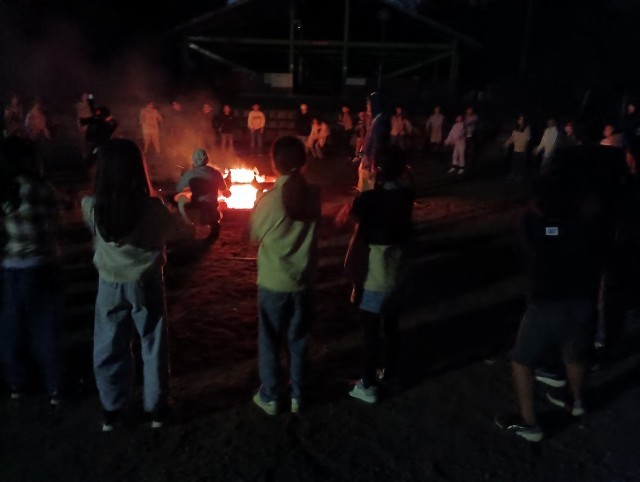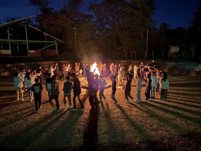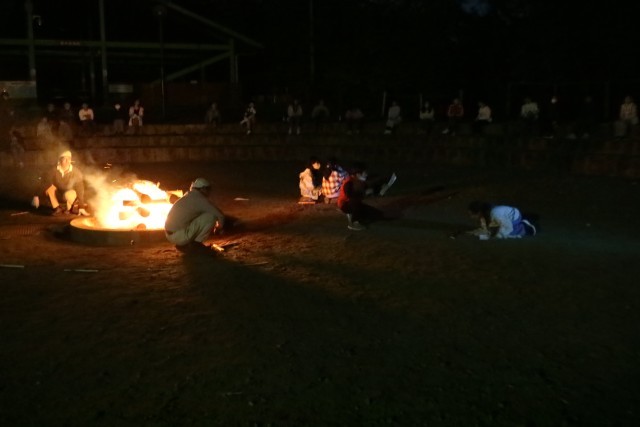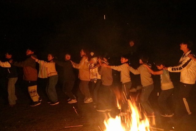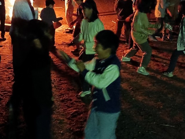 キャンプファイヤーの様子です。火の神から「勇気」「自立」「友情」の3つの火を授かり、火を囲んでみんなで歌い、踊り、楽しみました。秋の星空のもと、5年生の団結の絆が深まる和やかで楽しいファイヤーとなりました。