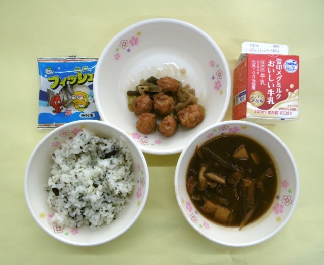今日の給食は、主食が「わかめご飯」、主菜が「れんこんと鶏団子の揚げ煮」、汁物が「なめこのみそ汁」、そして「牛乳」と「鰯の干し小魚」です。