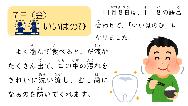 今日の食育メモは、「いい歯の日」についてでした。ぜひ、ご家庭でも話題にしてみてください。