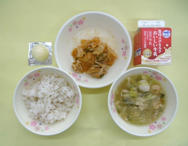 今日の給食は、主食が「麦ご飯」、主菜が「キムタクご飯の具」、汁物が「タイピーエン」、そして「牛乳」と「型抜きチーズ」です。