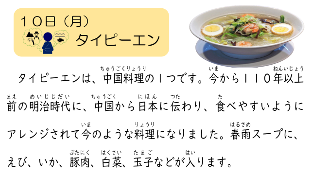 今日の食育メモは、「タイピーエン」についてでした。ぜひ、ご家庭でも話題にしてみてください。