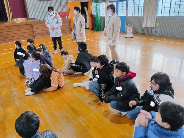 松原小学校の児童が考えたプログラムでもうじゅうがりや〇×クイズ、だるまさんがころんだ、みんなでダンスをしました。
