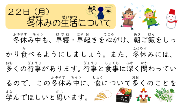 今日の食育メモは、「冬休みの生活について」でした。ぜひ、ご家庭でも話題にしてみてください。冬休み中も、なるべくいつもと同じ時間に朝ご飯を食べるようにしましょう。