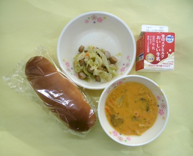 今日の給食は、主食が「ロールパン」、副菜が「キャベツとウインナーのソテー」、汁物が「キャロットポタージュ」、そして「牛乳」です。