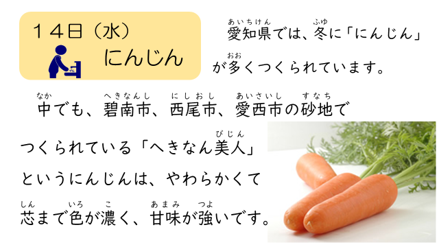 今日の食育メモは、「人参」についてでした。ぜひ、ご家庭でも話題にしてみてください。