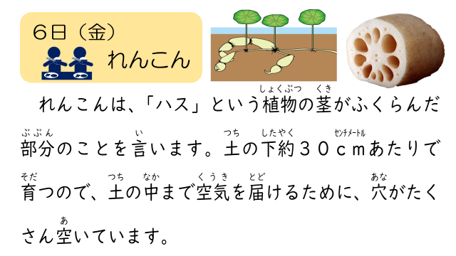 今日の食育メモは、「れんこんについてでした。ぜひ、ご家庭でも話題にしてみてください。