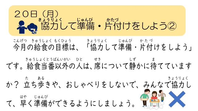 今日の食育メモは、「協力して準備・片付けをしよう」についてでした。ぜひ、ご家庭でも話題にしてみてください。