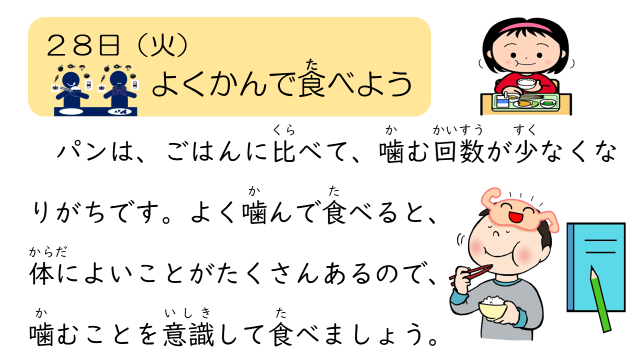 今日の食育メモは、「よく噛んで食べよう」についてでした。ぜひ、ご家庭でも話題にしてみてください。